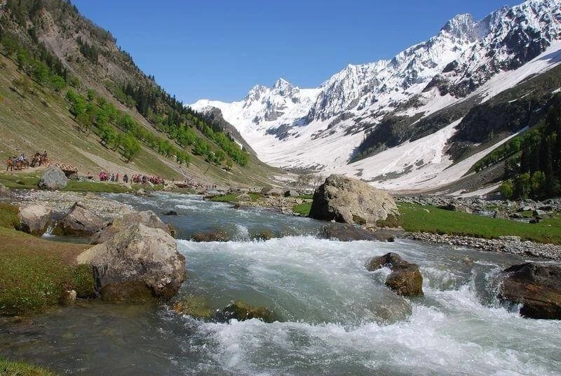 Along the way, you'll pass through picturesque countryside with snow-capped mountains, lush green forests, rolling hills, crystal-clear streams, and expansive rice fields. You'll also drive past Kangan town, a bustling local market, and Marmar, famous for its trout fields. In Sonamarg, you can enjoy a 3-hour walk, a cab ride, or even a horseback ride to the Thajiwas Glacier, a stunning spot known for its breathtaking meadows and natural beauty.